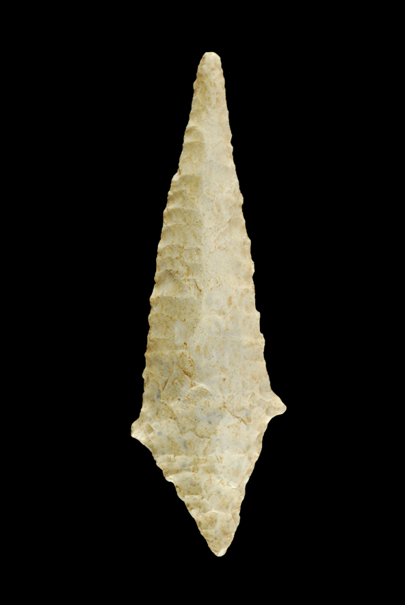 Punta de flecha de sílex con apéndices laterales, estrecha y larga. Presenta retoques planos bifaciales, cubrientes en una cara y profundos en la otra.