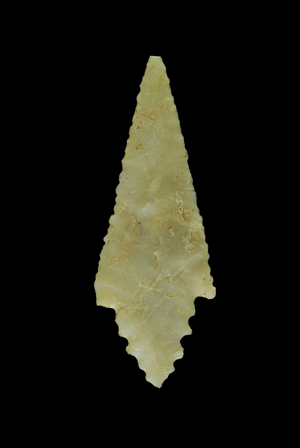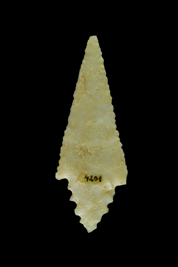 Punta de flecha de sílex con pedúnculo y aletas incipientes. Presenta retoque plano, cubriente y bifacial, con los bordes marcadamente denticulados en la zona del pedúnculo.