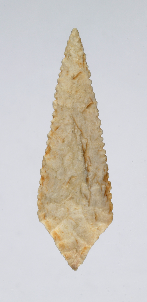 Punta de fletxa de sílex de forma romboidal i vores denticulades, amb retoc pla, cobrent i bifacial.