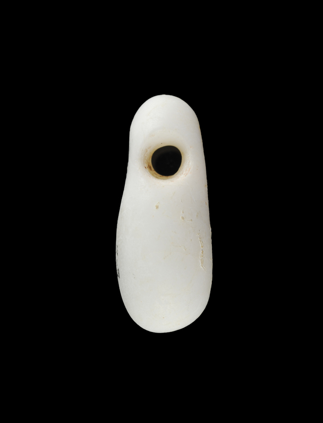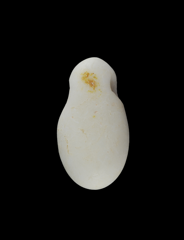 Penjoll oval sobre cant rodat blanc, escanyat en un dels extrems, sobre el que es situa la perforació bicònica perpendicular a l'eix.