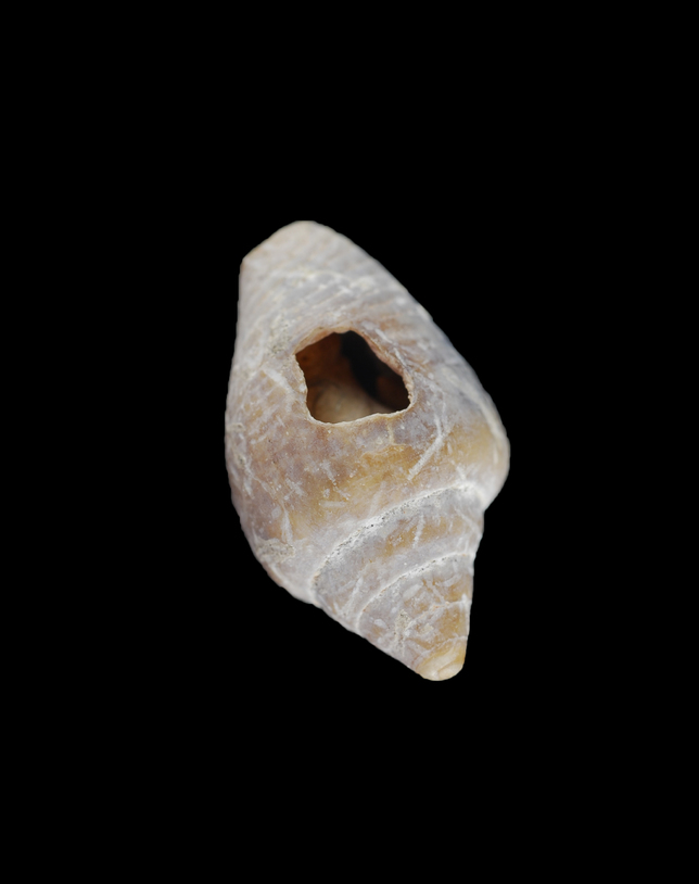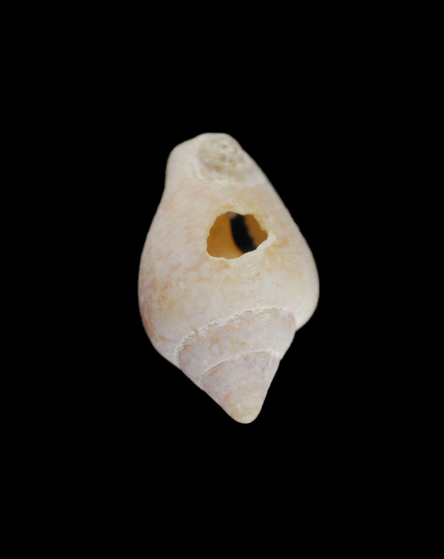 Tres closques de Columbella rustica amb perforació dorsal per a ser utilitzades com a penjoll.