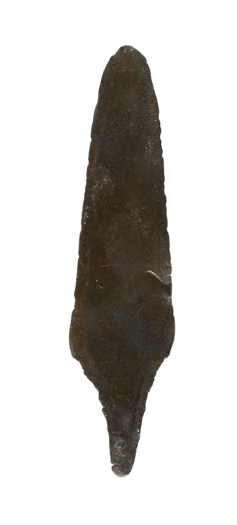 Punyal de llengüeta de coure de fulla curta amb les vores bisellades.