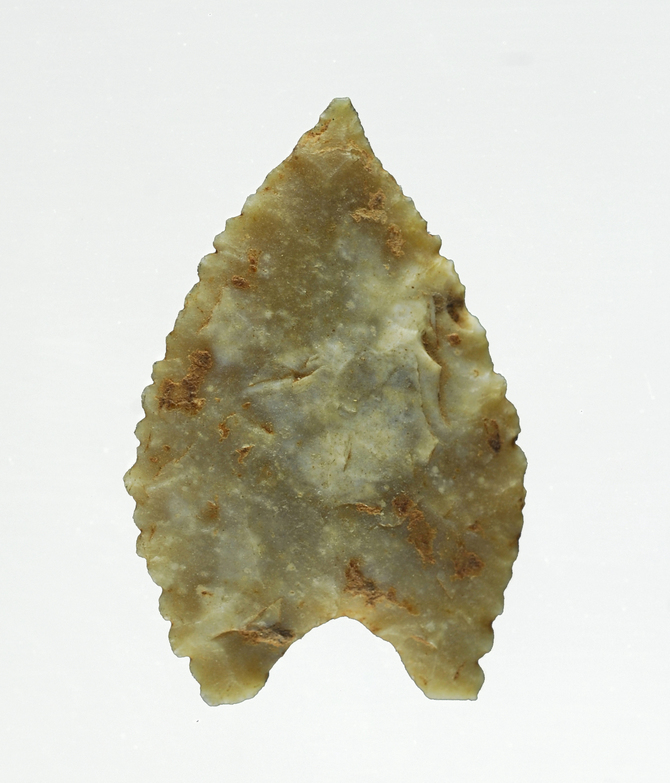 Punta de fletxa de base còncava amb retoc pla, cobrent i bifacial. Sílex clar.