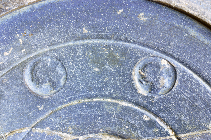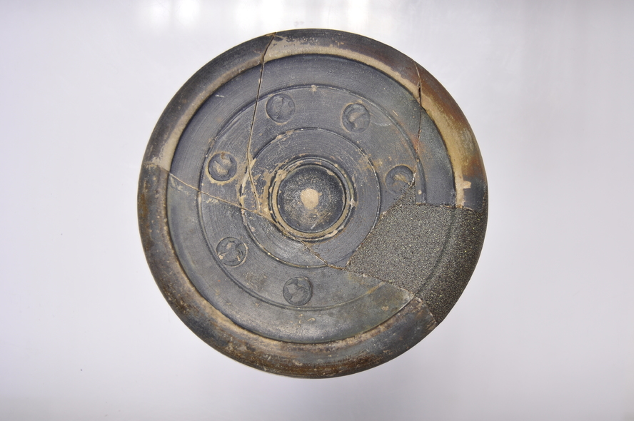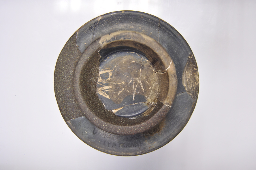 Pàtera de vernis negre del taller de les Petites Estampilles. El fons intern té tres cercles concèntrics incisos i es conserven set estampilles que representen un cap humà a la dreta. Sobre el fons extern hi ha tres signes ibèrics. Dos d'ells es lligen com a LA i el tercer, situat baix i amb una altra orientació, és il·legible.