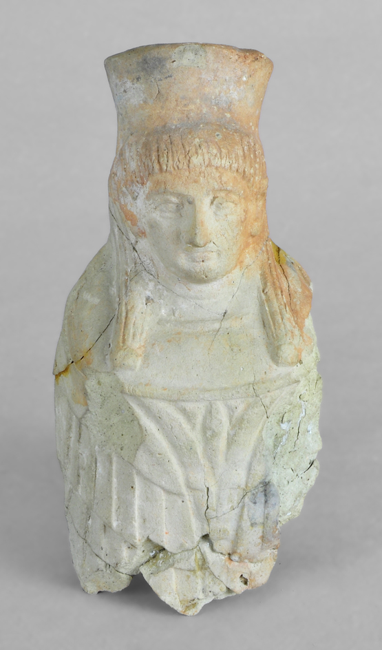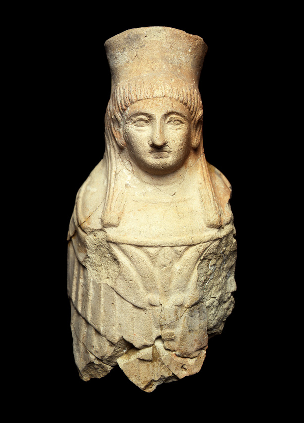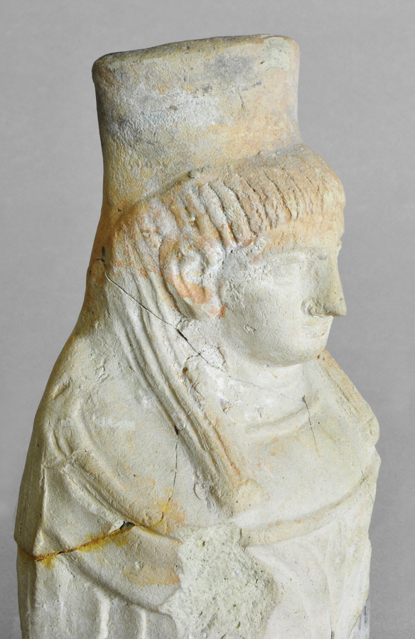 Figura femenina de terracota feta amb un motle univalve. És del tipus acampanat i representa a una dama o a la deessa Tanit. Està tocada amb kalathos sense decoració i té els cabells pentinats amb serrell i dos flocs no trenats de tipus klaft o egiptizante. Porta un mantell d'ales i en el pit una flor de lotus. La peça està fragmentada per la base i restaurada.
