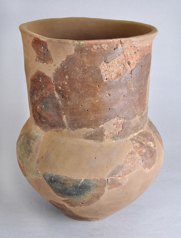 Urna de ceràmica a mà de cos globular amb coll alt cilíndric i vora engrossida. Fragmentada i restaurada.