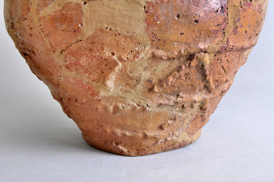 Urna de ceràmica a mà amb vora bisellada plana. Base plana. El terç inferior està decorat amb un fris de cordons aplicats formant motius triangulars. Fragmentada i restaurada.