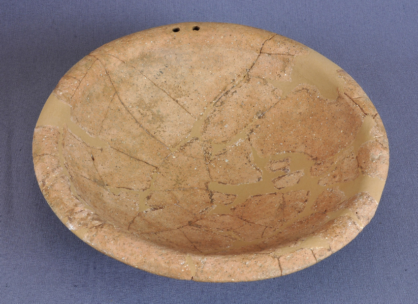 Plat de vora tornada i base plana. Hi ha dues perforacions de suspensió en la vora. Fragmentat i restaurat.