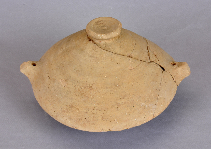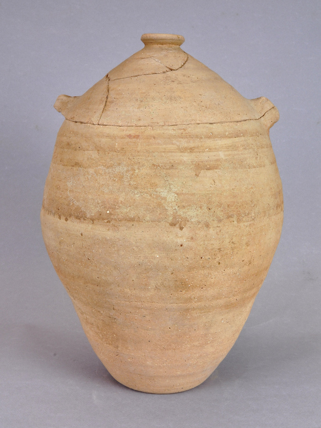 Urna d'orelletes. Decoració pintada de bandes i filets molt perduda. Tapadora amb pom anillat. Fragmentada i restaurada.