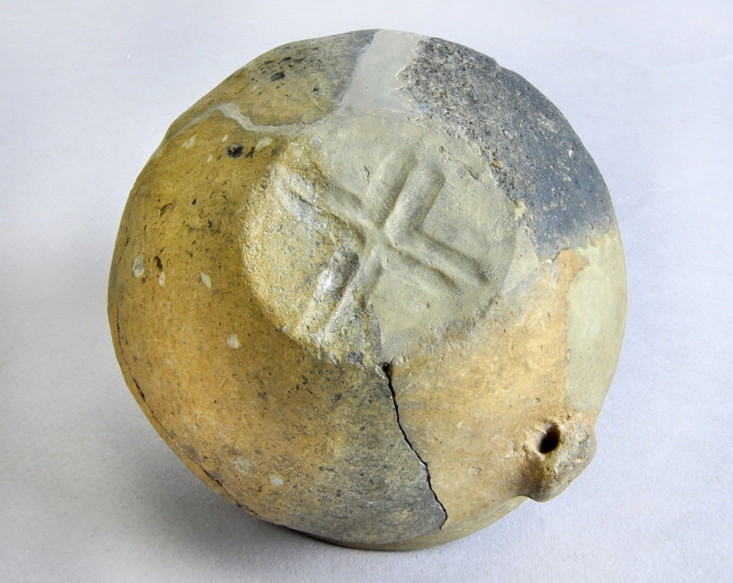 Bol carenat de ceràmica a mà amb ansa perforada i decoració acanalada. En la base té incisions formant una creu. Fragmentat i restaurat.