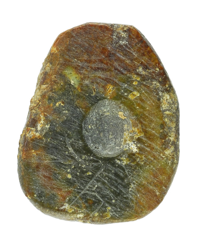 Perla discoïdal amb la perforació iniciada en ambdues cares, sense acabar. Facetes d'abrasió en tota la superfície. Pedra verda amb minerals marrons i rogencs.