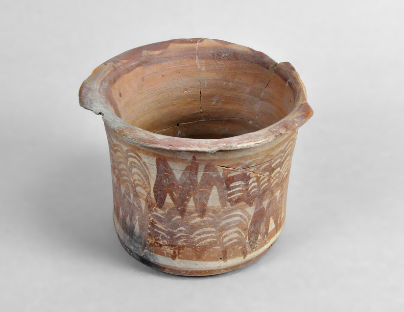 Càlat de vora exvasada i base còncava. Decoració pintada amb dos frisos delimitats per bandes amb teularets i rombes que es van alternant. Peça fragmentada i restaurada.