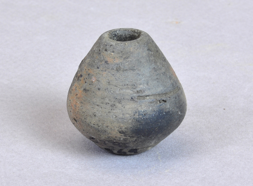 Fusaiola bitroncocònica amb part de la superfície ennegrida pel foc. Fragmentada i restaurada.