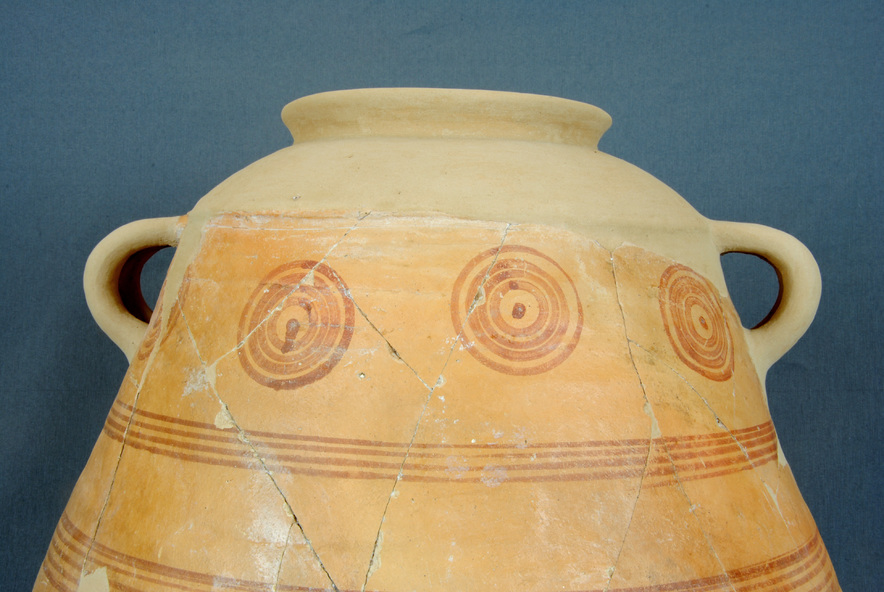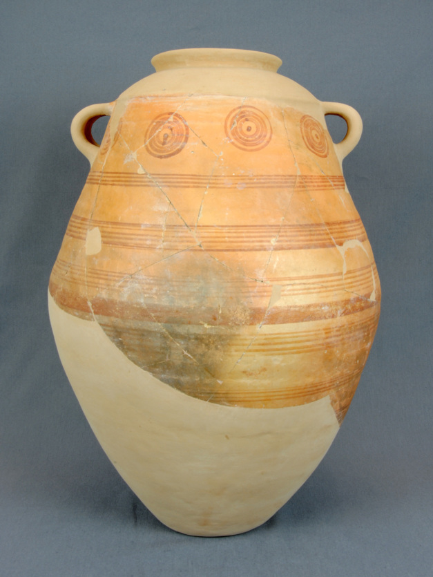 Tenalla amb muscle i anses verticals dobles. Decoració exterior pintada amb cercles concèntrics en la part superior, filets i bandes. Incompleta i restaurada.