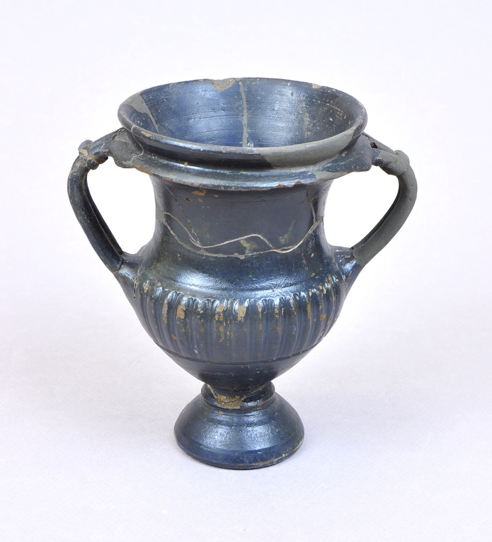 Copa de ceràmica completa, fragmentada i restaurada. Coll vertical, un poc exvasat, vora motllurada pendent i cos gallonat i peu destacat alt. Ansa geminada entrellaçada. Decoració amb garlanda incisa i pintada, formant una sanefa de fulles d'heura. És posible que la producció siga del tipus Gnathia, procedent de la regió suditàlica de l'Apúlia.