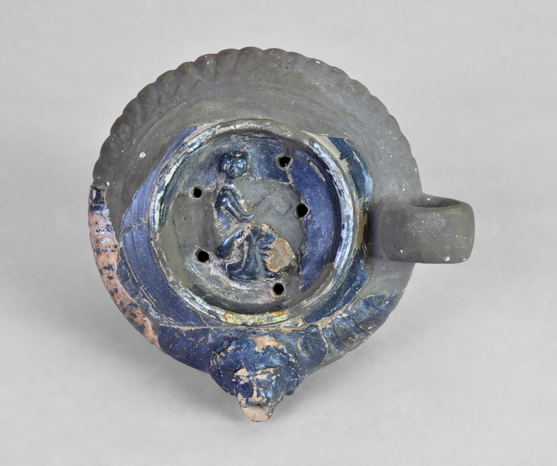 Guttus de barniz negro, posiblemente una producción calena arcaica. Es de cuerpo gallonado, pie moldurado y pitorro vertedor en forma de cabeza de león. Presenta una cubeta o filtro con cinco orificios, y una escena en relieve de una figura femenina sedente. El barniz negro es brillante y está aplicado a pincel en torno a la cabeza del león y por inmersión en el resto, con marcas de huellas digitales en torno al anillo del pie. Hay decoración sobrepintada en blanco alrededor del disco de la cubeta y un orificio en el lateral del mismo. Pieza fragmentada y restaurada.