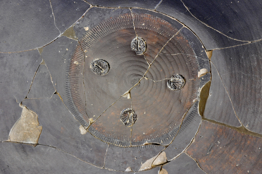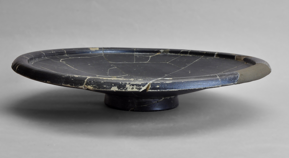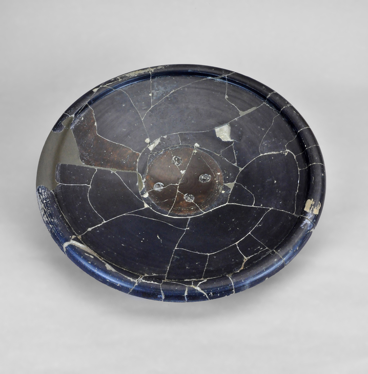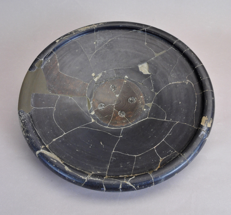 Plato de barniz negro de producción campaniense A. Presenta un barniz de buena calidad, de color marrón en la parte central interna. La decoración se compone de cuatro palmetas radiales y ruedecilla. Tiene dos orificios de suspensión en el pie. Pieza fragmentada y restaurada.