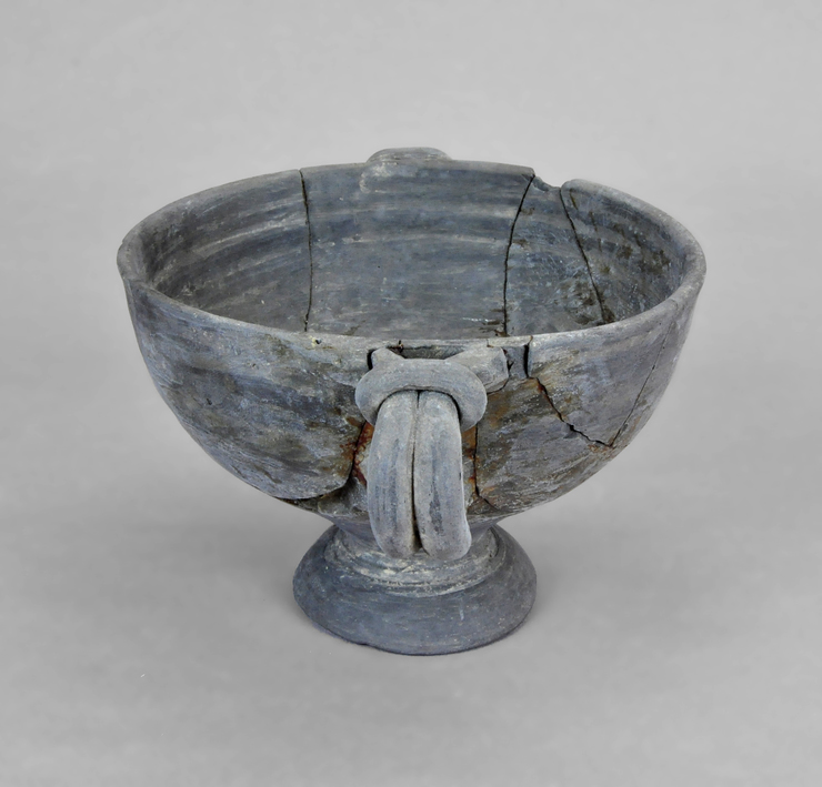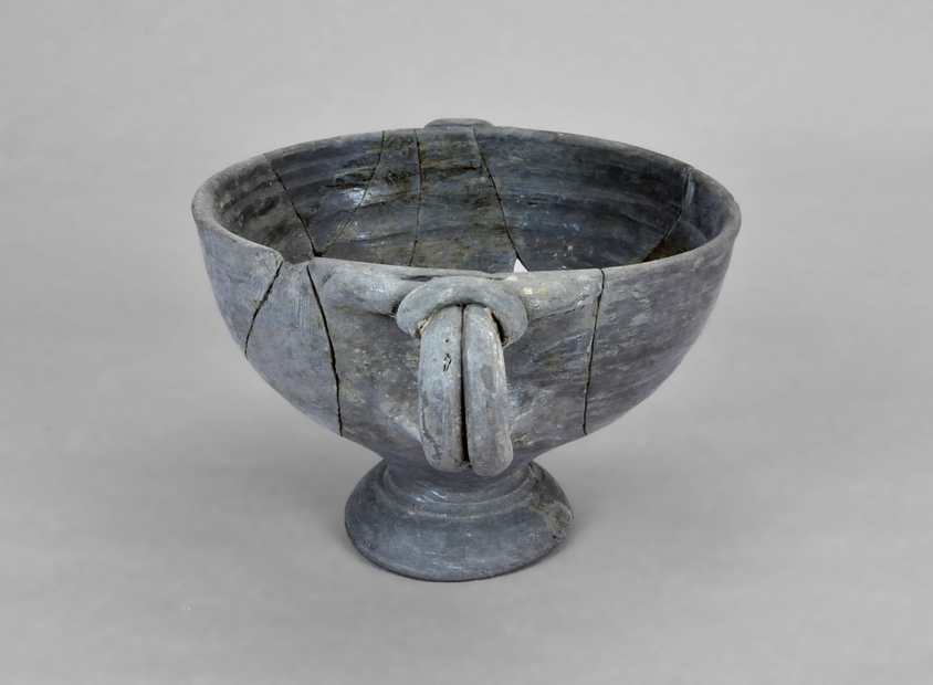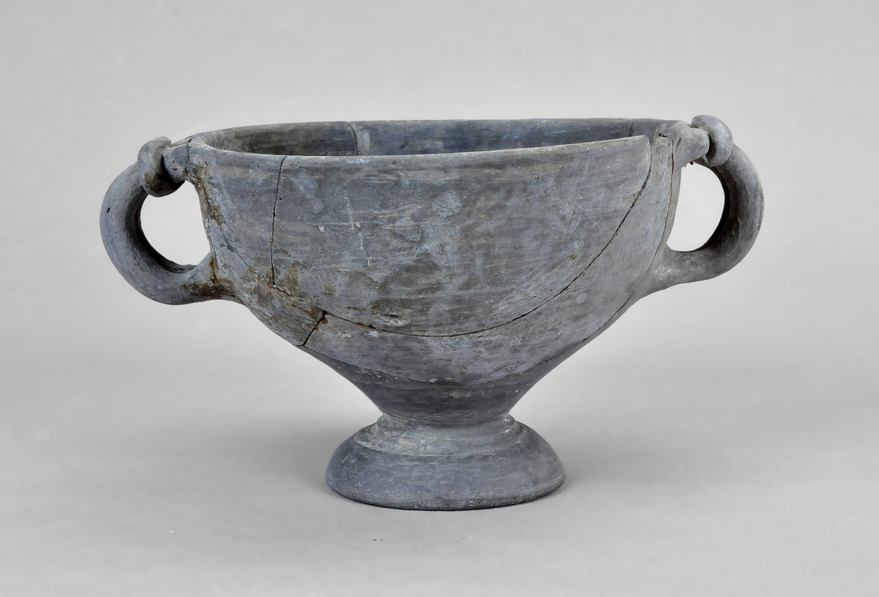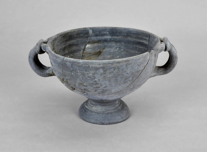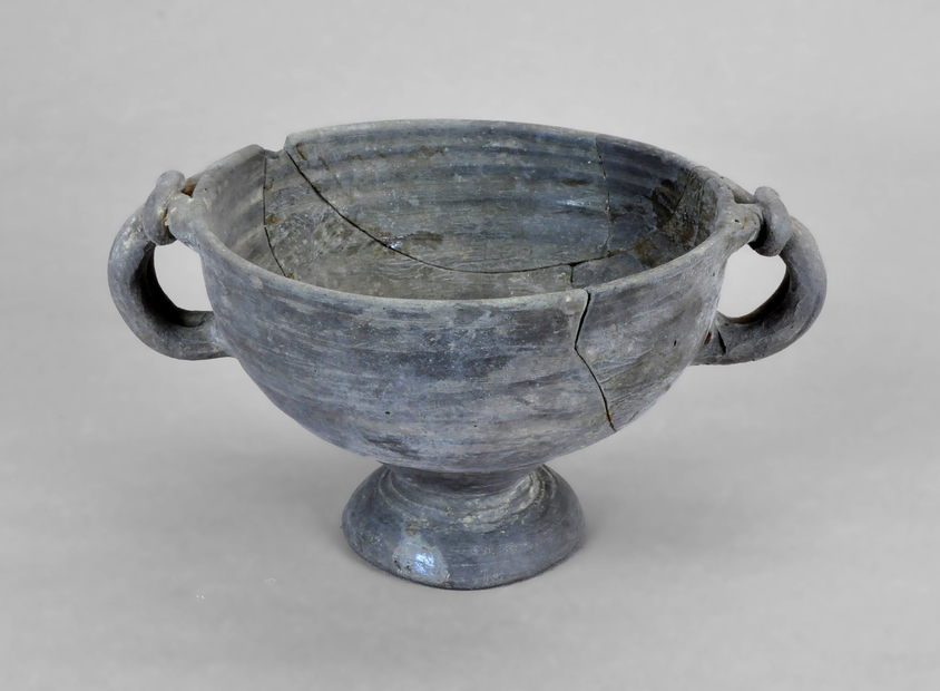 Copa de imitación en pasta gris de la forma 68c de Morel, de producción indeterminada. Cuerpo semiesférico, pie alto de base cónica y dos asas verticales de doble nervadura anudadas transversalmente en la parte superior. La superficie externa está pulida y en la interna tiene marcas del torneado. Pieza fragmentada y restaurada.