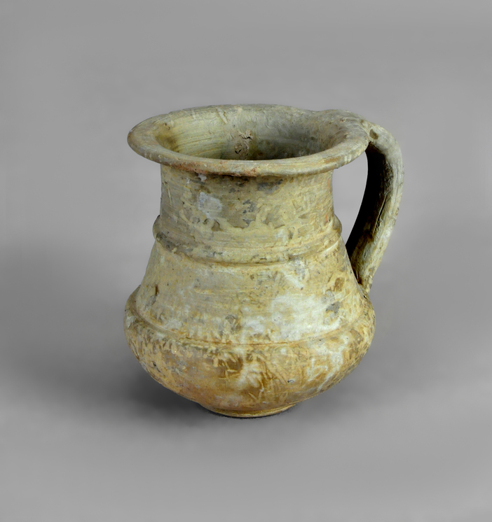 Jarra gris de tipo ampuritano. Cuerpo cilíndrico y parte inferior troncocónica, con dos molduras, una en el cuello y otra en el tercio inferior. Borde exvasado, asa vertical de sección en cinta y base cóncava anillada. Superficies exteriores pulidas y con engobe. Pieza completa.
