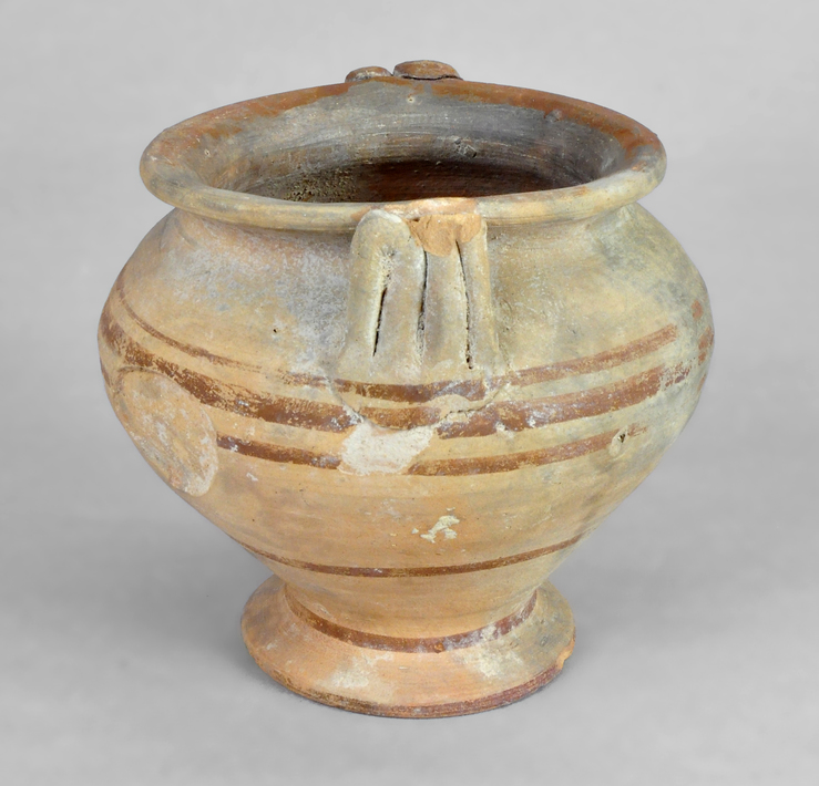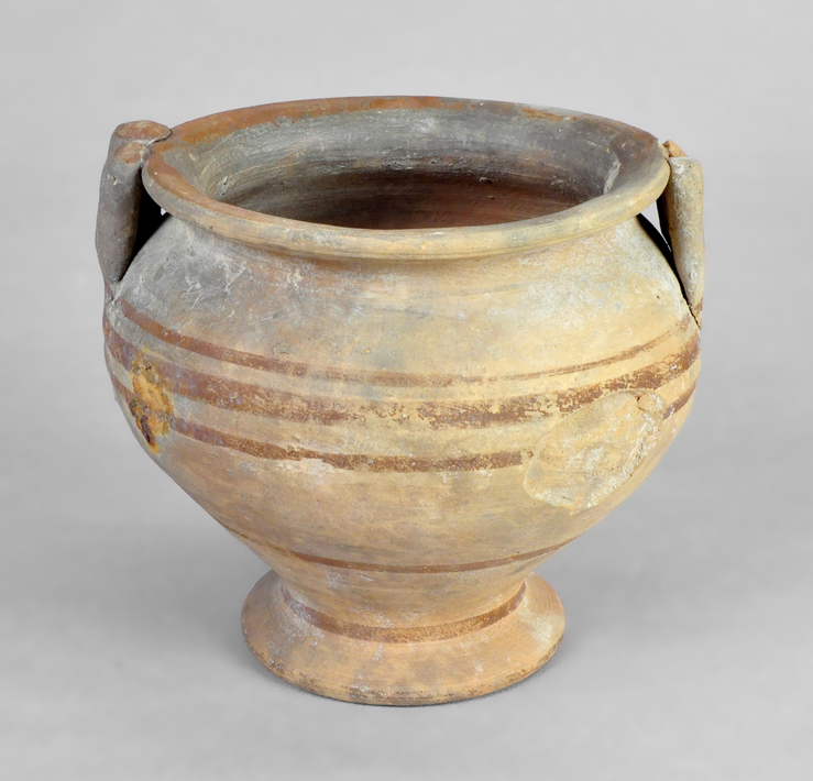 Escifo de imitación ibérica. Cuerpo globular, borde vuelto, asas dobles pegadas al cuerpo y base diferenciada cónica. Decoración pintada con banda en el labio, dos filetes y banda en el diámetro máximo, banda estrecha en el tercio inferior y otra banda estrecha en el arranque de la base. Tiene improntas de hierro adheridas a la superficie exterior.