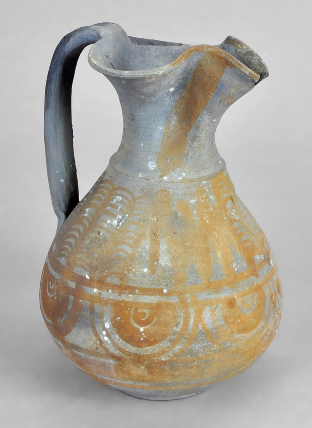 Jarro de perfil piriforme, base indicada y asa vertical de sección en cinta. En la unión del cuello con el cuerpo hay un baquetón. Decoración exterior pintada con un trazo vertical a cada lado del pico vertedor, en el tercio superior cenefa de tejadillos y trazos en zig-zag verticales, dos bandas estrechas, semicírculos y banda entre filetes. Toda la superficie está quemada.
