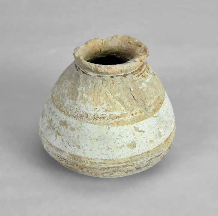 Botella de perfil globular con borde engrosado y base cóncava. La superficie exterior tiene restos de un engobe blanquecino, sobre el que se ha aplicado la decoración pintada de bandas.