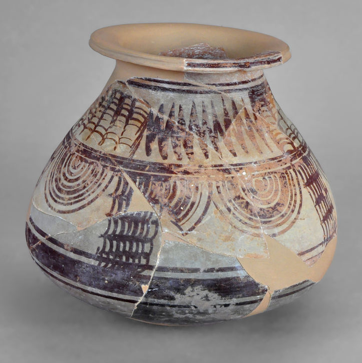 Tinajilla sin hombro con cuello indicado y borde moldurado. El eje de torneado de la pieza está desviado. Decoración pintada sobre engobe blanquecino: dientes de lobo en el borde, dos filetes, cenefa de tejadillos y líneas en zig-zag horizontales, banda entre filetes, cenefa de semicírculos concéntricos, cabelleras y banda entre filetes y banda estrecha. Pieza fragmentada y restaurada. Algunos fragmentos están quemados.
