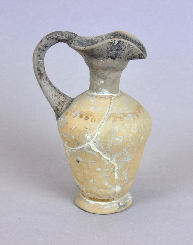 Pitxer de cos de perfil bitroncocònic i boca trilobulada. Decoració pintada amb línia a l'altura dels muscles, sèrie de punts gruixuts allargats i sèrie horitzontal de sectors de circumferències concèntriques. Fragmentat i restaurat.