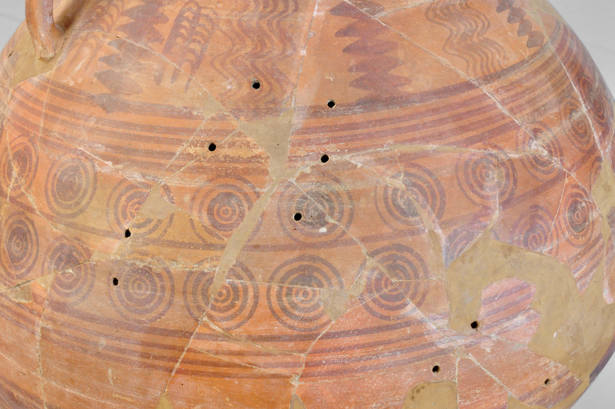 Tinaja de labio moldurado, borde saliente, cuerpo bitroncocónico, base indicada y dos asas de sección en cinta. Decoración pintada geométrica con una cenefa de rombos alternando con cabelleras y otra de dos series de círculos concéntricos. Bajo ésta, bandas y filetes. La pieza está desviada de su eje de torneado. Tiene agujeros de reparación en la parte media. Pieza fragmentada y restaurada.