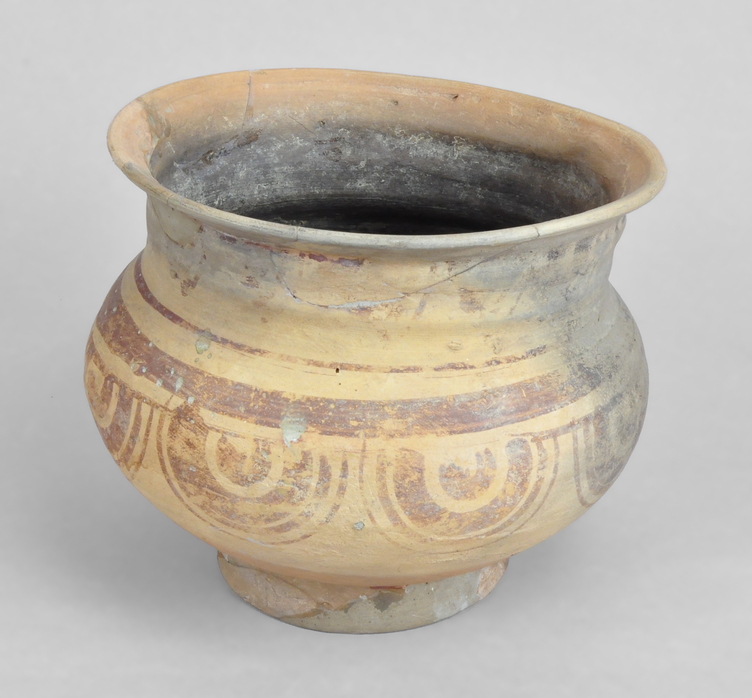 Recipiente cerámico de perfil caliciforme, borde exvasado, cuerpo globular y pie anillado. Decoración pintada con filetes y arcos de círculos concéntricos en el cuello y, en el cuerpo, semicírculos concéntricos que penden de una banda. En el inicio del pie hay una línea irregular. El plano del torneado no es horizontal y la parte superior de la pieza está inclinada. El interior está quemado. Pieza fragmentada y restaurada.