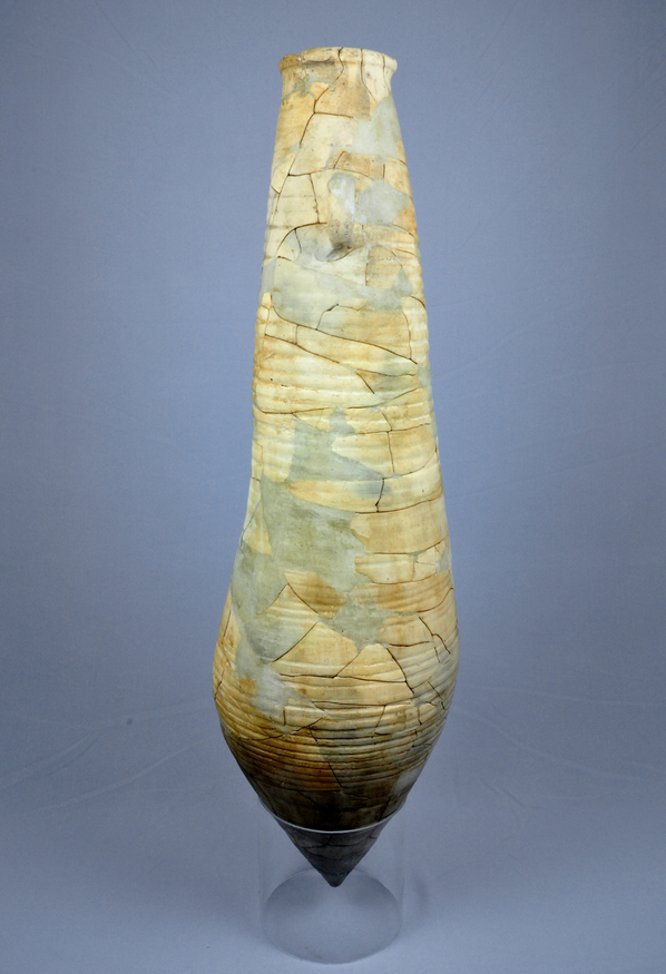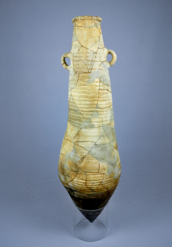 Àmfora púnica d'Eivissa, de pasta de color marró. Fragmentada y restaurada. Cos bicònic amb acanaladures paral·leles des de la part superior de les anses fins la part inferior del diàmetre màxim. Anses de secció circular. Base apuntada
