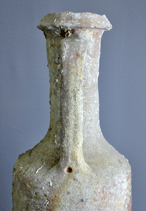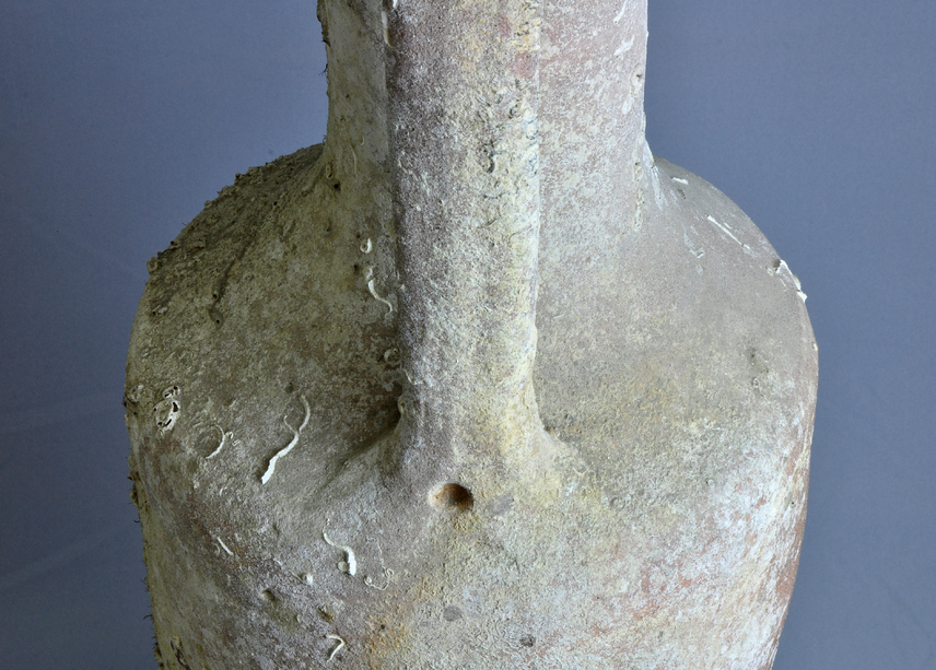 Ánfora romana de pasta marrón con engobe beige. Presenta concreciones marinas en la superficie.